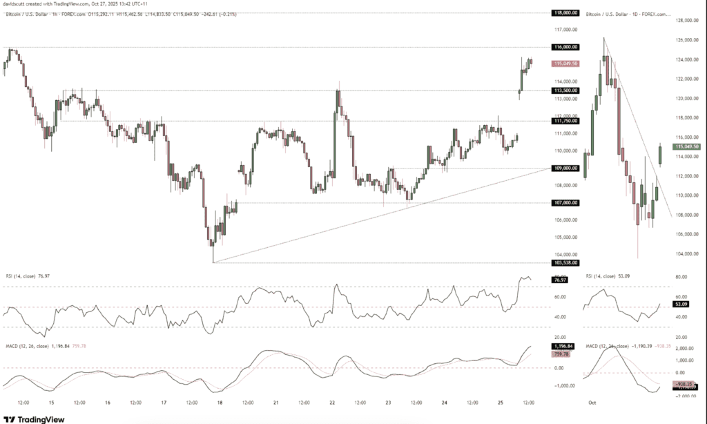 In technical terms, Bitcoin has broken out of the resistance zone between US $113,500 – US $114,400 and is now testing the broader breakout target near US $116,200.
