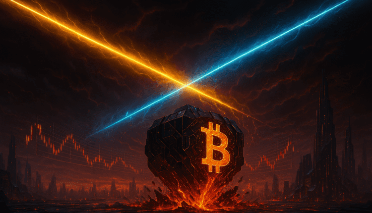 The death-cross doesn’t appear in isolation. It aligns with three major structural stressors shaping Bitcoin right now: