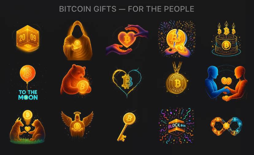 - 🎁 Bitcoin Gifts — playful, thematic crypto stickers that capture the spirit of blockchain generosity.