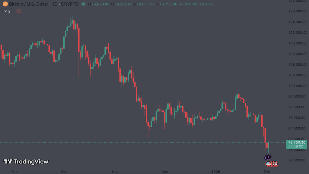 The $75,000–$76,000 area acted like a high-interest demand zone, with aggressive absorption visible in the rebound structure. In many past cycles, that kind of “liquidity sweep” sets the stage for a tactical rebound — not necessarily a full trend reversal, but a tradable move as leverage resets and spot demand steps in.