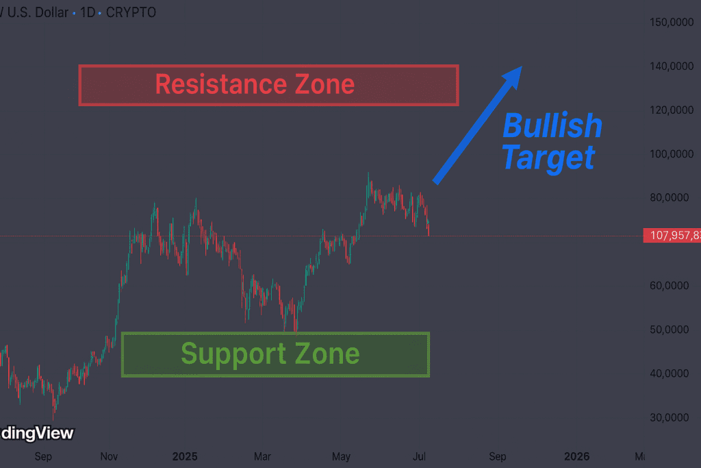 - Support Zone: $106K–$107K (green zone).